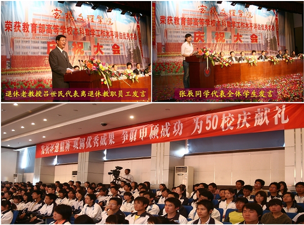 中文系党天正教授、教务处副处长田延峰博士、外语系学生张辰、退休老教授吕世民分别代表教师、党政管理员工、全体学生和离退休教职工做了发言。他们在发言中用饱含深情的语言回忆了那一个个难忘的日子、一幕幕感人的事迹,一致表示要继续发扬评建精神,励精图治、艰苦奋斗、忘我工作,为圆满完成“申硕”这一艰巨任务而不懈努力,以优异成绩向50年校庆献礼。