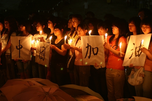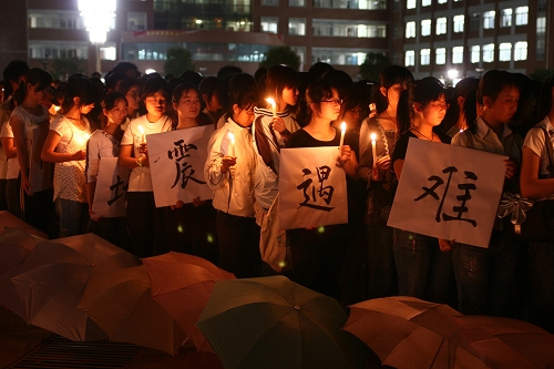 外语系学生手捧百余支蜡烛,围成心形,并在其中用600支蜡烛围出“5·12”字样,他们手持“外语系全体师生沉痛悼念汶川地震遇难同胞”、“汶川挺住,中国加油”的标语牌,整个活动场面庄严、肃穆。