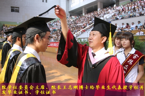 王志刚在讲话中代表学院党政领导和全体师生,对圆满完成学业、即将走上工作岗位的毕业生们表示热烈祝贺,同时对广大毕业生提出了殷切的希望:一要坚定理想信念,把个人的前途与祖国的需要紧密结合起来,在工作岗位上建功立业,做一个具有历史使命感和社会责任心的人。二要不断学习,终身学习,勤于实践,求实创新,做一个事业上不断进取的人。三要发扬文理精神,自强不息,做一个意志坚强,敢于面对挑战,敢于超越自我,成就人生的人。四要学会感恩,懂得回报,一生善待“三位母亲”—— 母亲、母校、祖国;不要忘记“三个地方”—— 出生之地、求学之地和工作之地,做一个诚实守信、知恩图报的人。他还诚挚邀请毕业生们在学院50华诞的时候回母校共襄盛举。