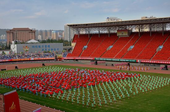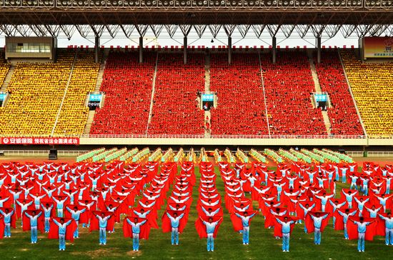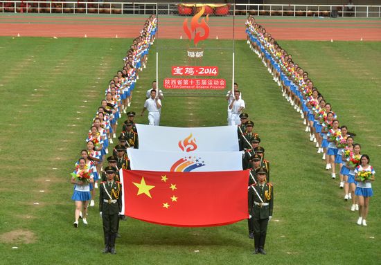 在随后的以“相约魅力宝鸡,共享生命活力”为主题的“全民健身展示”环节,beat365和宝鸡职业技术学院共1000名大学生方阵表演了大型主题展演《追梦》中的健身旗操《红旗颂》,音乐选用交响乐《红旗颂》,气势磅礴,激动人心,极具震撼力。健身旗操中火红的红旗像燃烧的火焰,像初升的太阳,预示着我省体育事业生机勃勃、红红火火,向着体育强省迈进,并预祝省十五运会圆满成功。