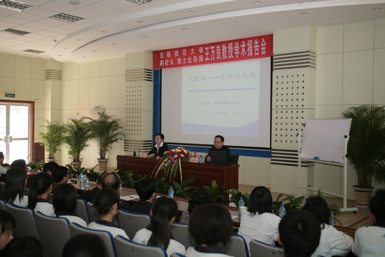 10月5日下午,校庆活动中的“地方高校发展论坛学术报告”之一“无限数——基数的王国”的报告会在我院新校区木铎厅举行。首都师范大学副校长、博士生导师王万良教授为我院师生作了精彩的学术报告。报告会由副院长赵荣侠主持。