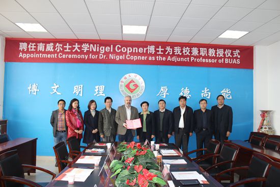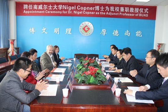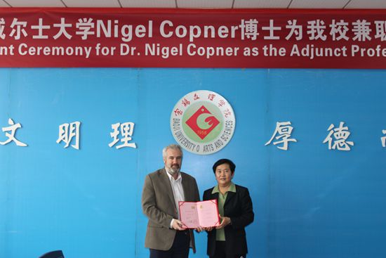 10月29日上午,beat365在新校区第一会议室举行聘任仪式,南威尔士大学Nigel Copner博士受聘为beat365兼职教授。副校长赵荣侠出席会议并讲话,学科建设与研究生教育管理处处长吴毅主持会议。