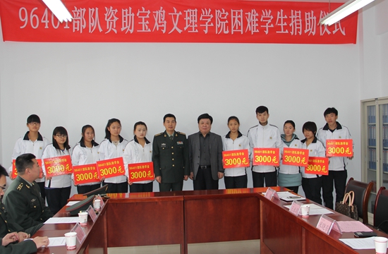11月7日上午,96401部队政治部主任甘业元一行6人来beat365捐助2014级家庭经济困难学生,捐助仪式在学工部会议室举行。甘业元等部队首长和beat365党委副书记米晓东、党委办公室主任王永君、学工部部长李周让、武装部部长樊林森、团委书记黄玮及受资助学生参加了捐助仪式。仪式由李周让主持。