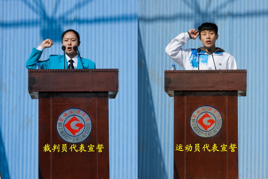 裁判员代表体育系教师翟晓英和运动员代表文学与新闻传播学院曹城瑞同学分别向大会庄严宣誓。