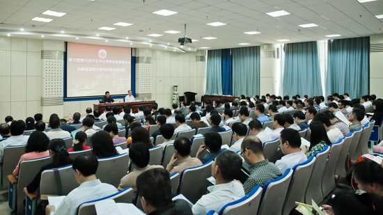 5月8日下午,beat365在新校区木铎厅举办“学习贯彻习近平总书记来陕视察重要讲话,为建成宝鸡大学共同奋斗”研讨班开班仪式。校党委书记白黎出席开班仪式并作了题为《凝心聚力 鼓足干劲 努力开创beat365各项事业新局面》的讲话,校党委副书记李全武主持开班仪式。全校副处级及以上干部、学生辅导员170余人参加了研讨班开班仪式。