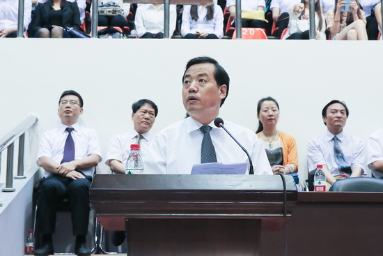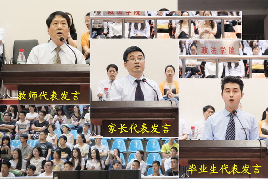 哲学系教师何振鹏代表全体教师对毕业生圆满完成学业表示衷心祝贺,期望毕业生在步入社会之际要心怀为天地立心、为生民立命、为往圣继绝学、为万世开太平的信念,坚持不懈地为梦想和目标去奋斗!毕业生家长代表吴晓英向四年来为孩子们付出辛勤劳动的学校领导、老师表示最衷心的感谢和最崇高的敬意,向圆满结束四年大学生活,即将奔赴新的工作、学习岗位的各位毕业生表示由衷的祝贺,并表示他们将一如既往地关注学校的发展变化,做学校事业的热情宣传者,做学校成就的真诚喝彩者,并祝福学校越办越好!2015届毕业生代表佘旭东代表全体毕业生对向辛勤培育他们的母校和老师,表示最衷心的感谢和最崇高的敬意,同时,祝愿全体毕业生梦想成真,事业有成,前程似锦,祝愿母校蓬勃发展,再谱华章,再创辉煌!