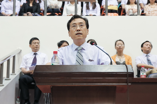 在典礼上,司晓宏校长发表了热情洋溢的讲话,他代表学校党委、行政向圆满完成学业的2015届毕业生表示热烈祝贺。他说,四年来,同学们见证了学校各项事业的蓬勃发展。同样地,也以优异的表现和合格的答卷为学校的发展助添了动力,赢得了光彩,并相信在未来的岁月中,同学们将以为祖国、为人民所做出的突出贡献来为母校赢得更多的社会美誉度。同时,他也向同学们承诺,在未来的几年里,学校将以铿锵的步伐坚定地向着宝鸡大学的宏伟目标迈进,并以跻身教学研究型大学行列的成就来为校友们凭添更多的自豪与骄傲。