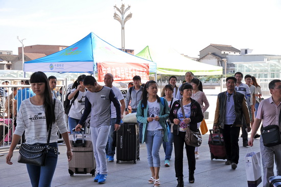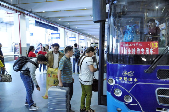 米晓东、傅志军、杨子元在结束新老校区的检查工作后,分别带领相关职能部门负责同志,前往火车站、火车南站和汽车东站等三处校外接待点,检查指导新生接待工作并慰问工作人员和学生志愿者。