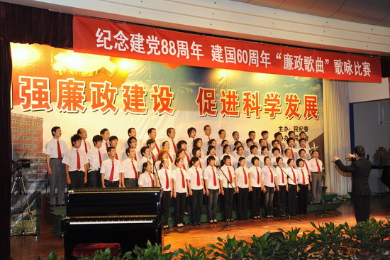 在庆祝中国共产党建党88周年、喜迎建国60周年到来之际,由院纪委、院工会、党委宣传部、院团委举办的以“加强廉政建设,促进科学发展”为主题的 “廉政歌曲”演唱比赛于6月19日下午和晚上在新校区音乐厅举行。有20个党总支代表队参加了比赛。