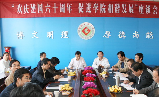 9月24日下午,学院举行“欢庆建国六十周年 促进学院和谐发展”座谈会。这次座谈会是我院庆祝中华人民共和国成立60周年系列活动的一项重要内容。院党委书记赵怀礼、党委副书记李全武,党群部门负责人、职能部门负责人代表、党总支书记代表、系主任代表、民主党派代表、博士代表等30余人欢聚一堂,共庆祖国60华诞。座谈会由李全武主持。