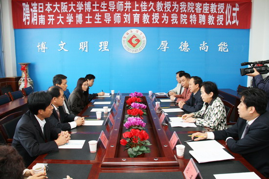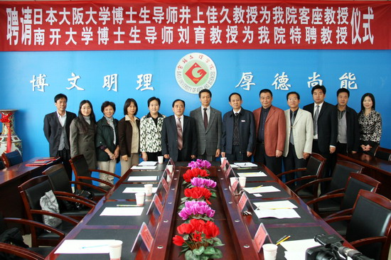 王志刚首先代表学院对井上佳久教授和刘育教授来院讲学并受聘为客座和特聘教授表示欢迎!他从学院历史、教师队伍、学科建设、区位优势、管理规范、人才质量较好、获教育部本科教学工作评估优秀和发展中的大学等八个方面为客人简要的介绍了我院基本情况。他说,学院正值全面启动实施授权学科、支撑学科建设的关键时刻,随着井上佳久教授和刘育教授的受聘,我院化学学科会更上一个层次。同时,能邀请井上佳久教授和刘育教授来我院指导学科建设工作,也是我们作为西部高校的荣幸。相信有井上佳久教授和刘育教授的指导,化学学科在学科建设、科研和教学方面会有更好的发展。随后,院长王志刚向井上佳久教授和刘育教授教授颁发了聘书。