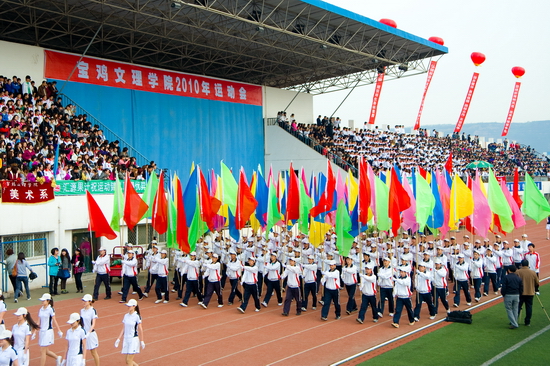 在开幕式和闭幕式上,我院大学生大型歌舞表演《青春节拍》、团体操表演《绽放2010》、《鼓扇如火》和学生的歌唱表演为运动会增添了靓丽的色彩。