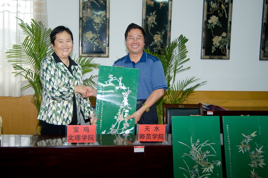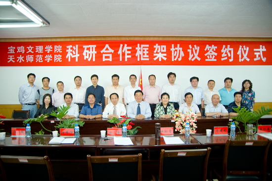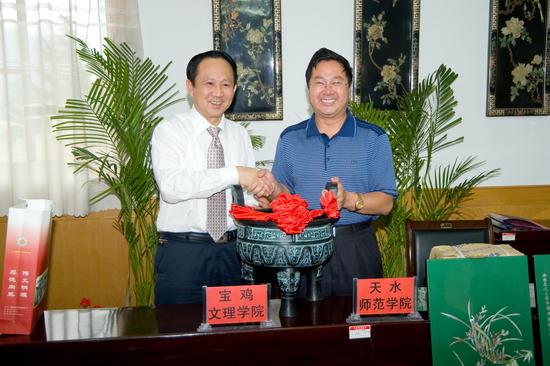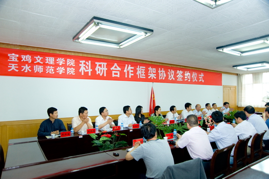 我院党委书记、院长王志刚代表学院党委、行政及全院师生员工,对天水师范学院各位领导在两校合作方面给予的支持和各位老师为此所付出的辛勤努力表示衷心的感谢!他从学院历史、教师队伍、学科建设和科学研究、区位优势、管理规范、人才培养质量、评估优秀、发展中的大学等八个方面简要介绍了我院的基本情况。他指出,关中与天水历史同源,文化同根,随着《关中—天水经济区发展规划》全面实施,为两校构建开放合作的新格局提供了新的切入点,以两校为纽带,发挥区域优势,在文化产业、旅游、区域资源开发与环境治理等领域开展广泛合作,必将为“关中—天水经济区”发展发挥生力军作用,以此形成鲜明的学科和科研特色,促进两校的可持续发展。他说,今天的合作将写入两校的发展史,希望两校进一步加强沟通、加深合作,确保各项合作项目顺利实施,不断开创优势互补、互利共赢、共同发展的新局面,为取得合作发展的丰硕成果而携手并肩、共同努力,为“关中-天水经济区”建设作出更大的贡献!祝愿beat365英国官方网站与天水师范学院的合作事业蒸蒸日上、明天更加美好!