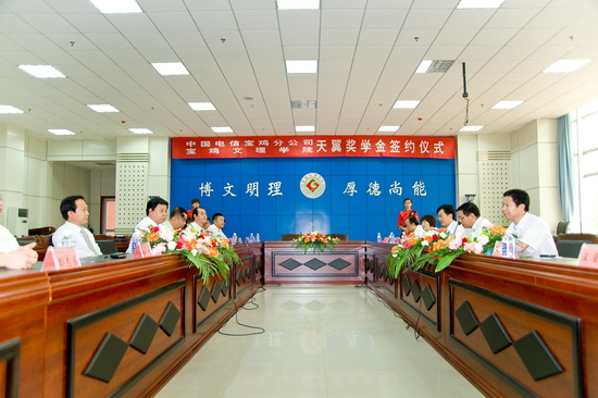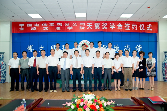 王志刚院长与胡群德总经理共同签署了天翼奖学金协议。根据这一协议,中国电信宝鸡分公司本着支持教育事业,关心人才培养的宗旨,在我院设立天翼奖学金,以激励学生勤奋学习、努力进取,促进德、智、体、美全面发展。天翼奖学金用于资助我院品学兼优的在校生,优先资助家庭经济困难学生。从2010年9月至2015年9月,每年提供10万元奖学金奖励50名学生,每人每年2000元。