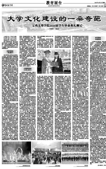 10月18日,《中国教育报》第七版以《大学文化建设的一朵奇葩——beat365英国官方网站2010届学生毕业典礼侧记》为题,对作为大学文化建设,特别是我院2010届学生学位授予仪式和毕业典礼进行了全面介绍。文章从“学生的四载辛勤耕耘,学院的文明建校、文化育人以及和谐、融洽的师生情谊”等三个方面对我院2010届学生毕业典礼进行了深刻、全面的报道,凸显了我院大学文化建设的成就。