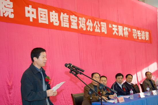 李全武代表院党委和行政对本次比赛的举办表示热烈祝贺,向中国电信宝鸡分公司的热情支持和我院羽毛球协会及所有工作人员的辛勤劳动表示衷心的感谢。他希望全院教职员工以此次活动的举办为契机,响应教育部、国家体育总局、共青团中央联合发出的阳光体育运动号召,倡导健康体育、快乐体育新理念,积极参加各类全民健身活动,推动我院全民健身运动持续、深入地开展。他要求各代表队和参赛队员遵守比赛纪律,服从比赛安排,尊重裁判,文明比赛,全体参赛队员要发扬“友谊第一、比赛第二”的良好体育道德风尚,赛出友谊,赛出风格,赛出水平。政法系党总支书记石桂荣、体育系教师魏延分别代表运动员和裁判员庄严宣誓。