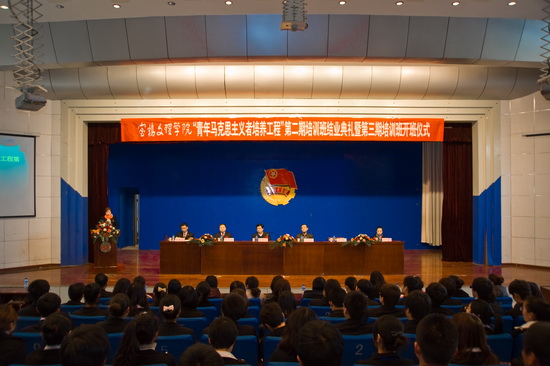 学工部(处)长李周让,党委宣传部副部长孙宏健,各系团总支书记、副书记,“青年马克思主义者培养工程”第二期培训班结业学员、第三期培训班参训学员及全院学生代表近400人参加了大会。(院团委供稿)