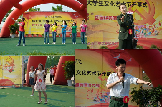 由各系选派的12组选手参加了红色经典诵读大赛。12个节目各有特色,选手们的精彩表现博得了现场观众的阵阵掌声。经过激烈角逐,来自中文系2010级播音与主持专业1班的杜兆、马戈阳拔得头筹。中文系团总支和美术系团总支获得最佳组织奖。