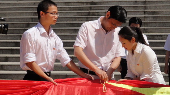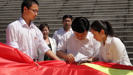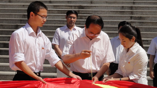 我院“青年马克思主义者培养工程”第三期培训班全体学员,怀着对党的深厚感情,历时15天,共同绣制出一幅长15米,宽10米的党旗,作为献给党90岁生日的特殊礼物,以表达文理学子对党的无限热爱与崇敬之情。活动仪式上,院领导为党旗完成最后绣制工作,全体党员在郑存库的带领下面向党旗,重温入党誓词。
