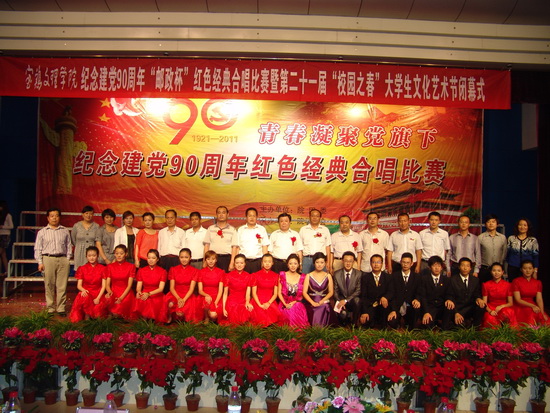 唱响红色经典,抒发时代豪情。在纪念建党90华诞之际,由院团委主办、院学生会承办的“青春凝聚党旗下”——纪念建党90周年“邮政杯”红色经典歌曲合唱比赛暨第二十一届“校园之春”大学生文化艺术节闭幕式于6月22日晚在新校区音乐厅隆重举行。院党委副书记米晓东等出席晚会。米晓东等与会领导为获奖单位和个人颁奖,院团委书记黄玮代表院团委致辞。