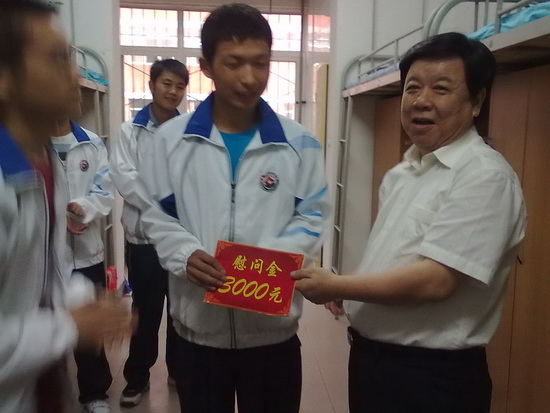 9月4日下午,院党委副书记米晓东一行深入学生宿舍看望、慰问化学化工系2011级新生李志永和同宿舍的同学们。米晓东对李志永同学来我院学习表示衷心的祝贺和热烈的欢迎。他详细的了解李志永的家庭状况,并询问他目前所遇到的困难。鼓励他勤奋学习,积极上进,以乐观的心态迎接灿烂的大学生活。最后,米晓东向李志永同学颁发了3000元慰问金。