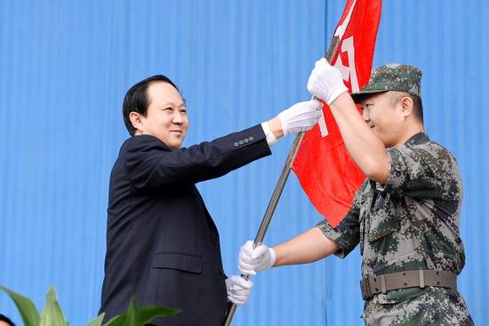 院党委书记、院长王志刚为军训团授旗