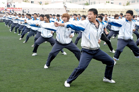 分列式结束后,由2011级300名、1000名新生组成的男子擒拿格斗、军体拳表演队进行了汇报表演。他们以昂扬的斗志、整齐划一的动作、霹雳勇猛之势,赢得了部队首长和学院领导的高度称赞,特别是军体拳表演队展示的“文理2011”文字,把整个汇报表演推向了高潮。