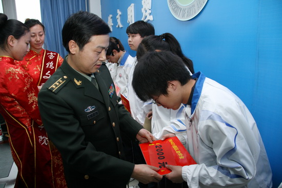 在捐助仪式上,96401部队首长为我院2011级10名家庭经济困难学生每人发放助学款2000元,共计20000元。