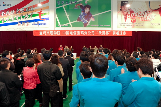 开幕上,李全武代表院党委、行政和工会对本次比赛的举办表示热烈祝贺,对中国电信宝鸡分公司和桐乡波力科技有限公司对本次比赛的大力支持表示衷心的感谢!他希望全体运动员能够奋力投入比赛,教练员能够精心予以指导,裁判员能够公正进行裁判。通过比赛,进一步加深友谊、切磋技艺、强身健体、增进和谐,彰显本次羽毛球比赛的宗旨:“友谊、和谐、拼搏、健康”,享受比赛乐趣,迸发运动热情,以强健的体魄和饱满的精神为学院的建设和发展做出新的贡献!外语系党总支副书记孙勇敏、体育系教师崔博分别代表运动员和裁判员宣誓。