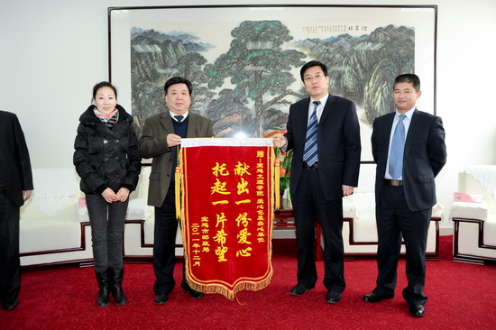 会上,庞博代表宝鸡市邮政局向我院赠送了“献出一份爱心,托起一片希望——爱心包裹热心单位”锦旗。