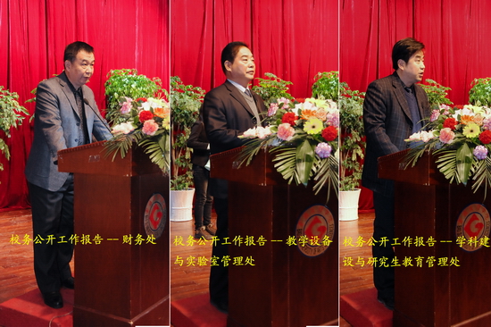 会上,财务处处长贾卫忠、学科建设与研究生教育管理处处长吴毅、教学设备与实验室管理处处长强晓艺分别作了院务公开工作报告。教代会提案审查委员会副主任委员党天正作了四届三次教代会提案落实情况的报告,提案审查委员会主任委员邓忠良作了本次大会代表提案征集情况的报告。