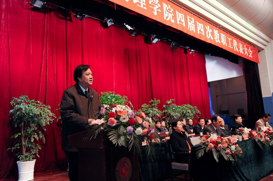 王志刚作了题为《团结奋进实现良好开局 再接再厉谱写崭新篇章》的工作报告。报告对2011年行政工作从九个方面作了简要回顾,分析了目前面临的主要问题,从八个方面明确提出了2012年行政工作的基本思路和主要措施:一是创新人才培养模式,修订人才培养方案,不断提高教育教学水平和人才培养质量;二是高质量完成立项建设工作各项任务,顺利通过国家验收并获批为硕士学位授予单位,提升办学层次;三是加强青年教师培养提高,持续提升教师队伍素质和水平;四是加强大学生教育管理工作,提高大学生综合素质和就业竞争能力;五是加强和完善后勤管理与服务,不断提高后勤保障能力;六是研究制定大学章程,加强大学文化建设,促进学院科学发展;七是认真做好安全稳定工作,促进和谐校园建设;八是充分发挥教职工集体智慧,推动学院持续发展。他在讲话中强调指出,2012年是我院获批为硕士学位授予单位的关键之年,也是完成“十二五”两大历史任务的重要之年,使命神圣,任务艰巨,让我们在省委教育工委和教育厅的指导和院党委的领导下,以邓小平理论、“三个代表”重要思想和科学发展观为指导,团结奋进,真抓实干,为学院科学发展做出更大贡献!
