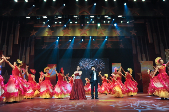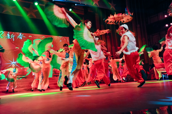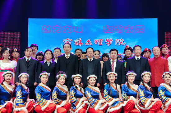 晚会在舞蹈《龙腾虎跃闹新春》宏大的场面中拉开序幕,热情奔放的表演,浓浓的喜庆之情撒满了礼堂的四面八方。舞蹈《扎西德勒》、《草原的溜溜城》、《踏歌起舞》及《外文歌曲大连唱》给我们带来了不同的民族风情,表演既潇洒自如、活力四射,又优雅柔美、脉脉含情。戏曲表演《说唱脸谱》、京剧《智斗》演员的一招一式、举手投足、酷似专业水平。舞蹈《炫舞时代》、《快乐你懂的》洋溢着青春的活力。歌伴舞《中华大家园》让文理人瞬间绽放出对祖国大家庭的热爱之情。创作节目《我爱我家》掀起了晚会的高潮,再现了我院教职工乔迁新居的喜人场景,表达出文理人不仅爱自己小家的浪漫温馨,更爱文理大家庭的凝聚和谐。《将进酒》诗画合璧为观众展示了国画的高雅、诗词的深邃。表演唱《文理新唱》、秦腔演唱《赞文理》则用不同的表现形式赞扬了我院各项事业取得的新发展、新变化、新成就。混声四部无伴奏合唱《长相思》、《花儿随想曲》让观众如痴如醉,充分展示了我院爱乐合唱团的艺术造诣。院领导表演的小合唱《革命人永远是年轻》再次掀起了晚会的高潮,激发了大家立足岗位努力工作、再创辉煌的信心和勇气。晚会在《今夜无眠》的欢乐氛围中圆满落下帷幕。晚会结束后,学院党政领导与演职人员合影留念。