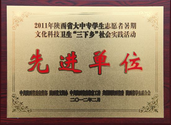 近日,我院团委被中共陕西省委宣传部、陕西省文明办、中共陕西省委教育工委、共青团陕西省委、陕西省学生联合会评为2011年陕西省大中专学生志愿者暑期文化科技卫生“三下乡”社会实践活动先进单位。同时,我院“帮助孩子圆梦,成就西山明天”赴西山社会实践服务队、“保护大秦岭”赴汉中佛坪生态环保调研队、“拓宽就业之路”青海社会实践小分队、“聚焦‘十二五’规划•践行科学发展观”赴眉县宣讲调研队被评为2011年陕西省大中专学生志愿者暑期文化科技卫生“三下乡”社会实践活动优秀团队;刘刚、王向锋、吴婷三位带队教师被评为2011年陕西省大中专学生志愿者暑期文化科技卫生“三下乡”社会实践活动先进个人。(院团委供稿)