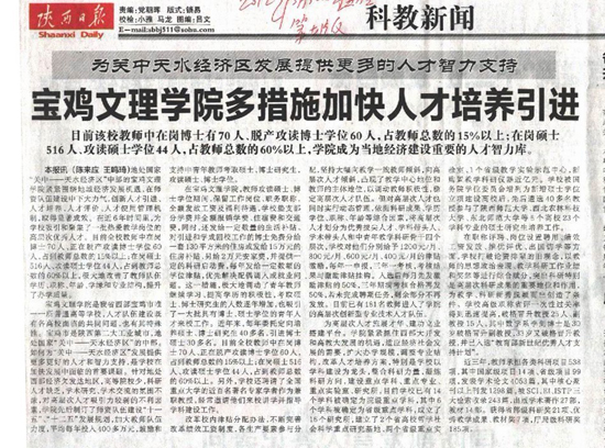 2012年3月30日,《陕西日报》(科教版)头条以《beat365英国官方网站多措施加快人才培养引进》为题,对beat365近些年来在师资队伍建设方面的所取得的成绩作进行了专题报道。《报道》充分肯定了beat365在师资队伍建设中先后制定和完善委托培养硕士、博士以及引进高学历高层次人才等相关政策;充分肯定了学校制定并完善高层次创新型专业技术人才的选拔、滚动与管理办法和不断完善人才考核评价机制,制定和调整专业技术职务任职资格评审工作规程和赋分办法等措施,并认为beat365师资队伍建设是贯彻国家和省市人才工作的重要举措,将进一步为关中天水经济区的发展提供更多的人才智力支持。