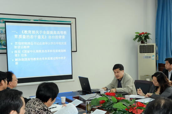5月3日上午,校党委在新校区第一会议室召开党委中心学习组扩大会议,集体听取了《教育部关于全面提高高等教育质量的若干意见》和《教育部财政部关于实施高等学校创新能力提升计划的意见》辅导报告。校党委中心组成员、教务处、学科建设与研究生教育管理处、科技处负责人参加了辅导报告会。党委书记、院长王志刚主持会议。