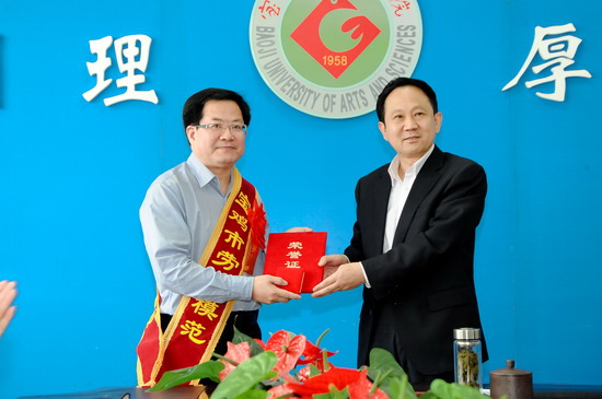 王志刚在会上为周旗教授佩戴了绶带、大红花,并颁发了荣誉证书。王志刚发表了热情洋溢的贺辞。他在贺辞中代表学校党委行政和全校师生员工向周旗教授表示热烈的祝贺和崇高的敬意。他指出,周旗教授被宝鸡市委、市政府命名为宝鸡市劳动模范,这不仅是市委、市政府对周旗教授个人的表彰,更是对beat365广大教职员工在宝鸡市经济社会建设和社会发展所作贡献的肯定,这不仅是周旗教授个人的荣誉,也是全校教职员工的荣誉。周旗教授是beat365培养的优秀拔尖人才,在科研上为学校作出了重要贡献,是实现beat365国家级科研项目零的突破的开拓者,是beat365一人承担国家级科研项目最多的一位教师,为学校争得了许多荣誉。王志刚说,周旗教授用自己创造性的劳动诠释了宝文理大学精神,为广大师生树立了榜样。我们要发扬“爱岗敬业,甘于奉献,勇于创新,争创一流”的劳模精神。校党委和行政号召全校教职员工向劳模学习,做好本职工作,认真实施学校十二五及中长期发展规划,为把beat365建设成为“管理科学、质量优良、特色鲜明、省内外同类院校一流水平的多科性的大学——宝鸡大学”而努力奋斗!他同时也向周旗教授提出了希望,希望周旗教授珍惜荣誉,谦虚谨慎,发扬成绩,再接再厉,充分发挥劳动模范的带头作用,在自己的工作岗位上再创新的业绩,为学校的建设发展作出新的贡献。