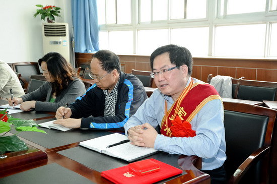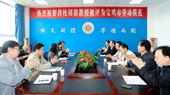 5月3日上午,beat365在新校区第一会议室召开座谈会,热烈庆祝地理科学与环境工程系周旗教授当选为宝鸡市劳动模范。党委书记、院长王志刚,党委副书记、工会主席李全武出席座谈会。