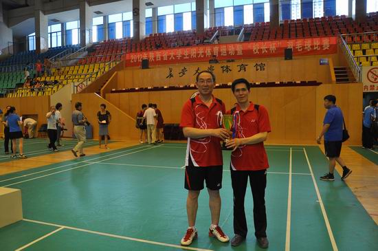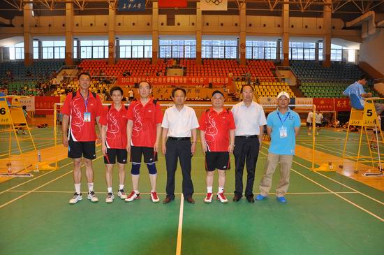由陕西省大学生体育协会主办、长安大学承办的2012年陕西省高校“校长杯”羽毛球比赛于6月9日—10日在长安大学体育馆隆重举行。beat365代表队由党委书记、院长王志刚担任领队,体育系教师龚明担任教练,校党委副书记米晓东和体育系教师樊晓仑、校党委副书记李全武和教务处职工路宝军组成两对男子双打参赛。
