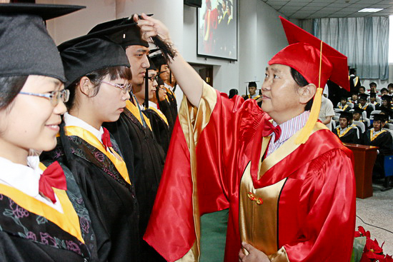 在学位授予仪式上,伴随着优美的钢琴旋律,毕业生依次上台,王志刚亲自为毕业生颁发学士学位证书,与他们亲切握手、寄语祝福并合影留念。傅志军、赵荣侠分别为全院17个系的毕业生一一扶正流苏、整帽拨冗。