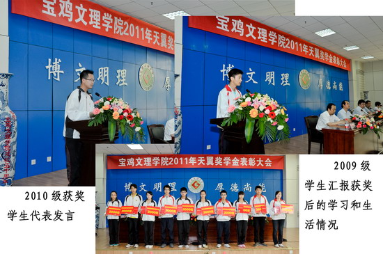 会上,校大学生资助管理中心主任刘景世宣读了《beat365英国官方网站关于表彰2011年天翼奖学金获得者的决定》。双方领导为获奖学生颁发了奖金和证书。获奖学生代表中文系赵晓邑和经管系杨博向中国电信宝鸡分公司和beat365领导汇报了一年来的思想、学习、生活中的情况和取得的成绩,表达了对中国电信宝鸡分公司的感激之情及继续努力的决心。