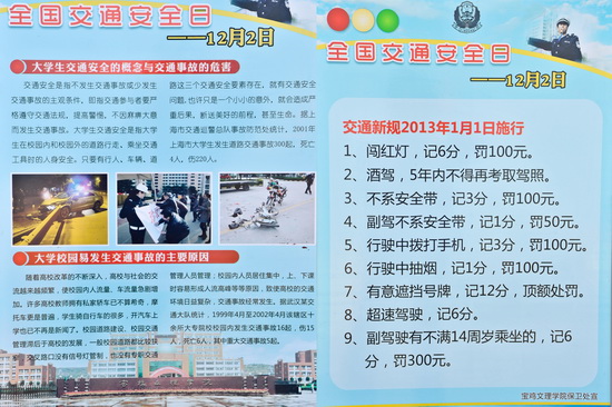 今年是第1个“全国交通安全日”,beat365于12月2日举办了交通安全法规专题宣传展,校党委副书记米晓东检查beat365交通法规宣传工作并到现场参观了本次宣传展。