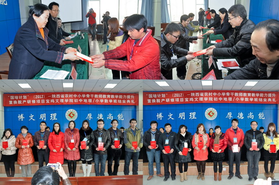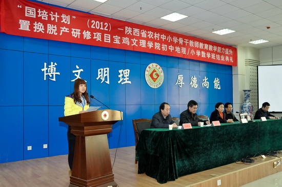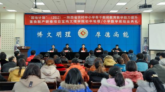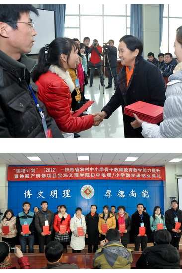 1月11日下午,beat365在新校区甘棠厅隆重举行了“国培计划”(2012)陕西省农村中小学优秀青年教师教育教学能力提升置换脱产研修项目beat365英国官方网站初中地理、小学数学培训班结业典礼。beat365副校长赵荣侠教授、继续教育学院院长王陆军教授,“国培计划”小学数学学科首席专家、数学系主任赵天绪教授和地理与环境工程学院郭俊理教授以及来自全省各地市农村基层一线的81名初中地理、小学数学学科参训教师参加了结业典礼。继续教育学院副院长田富平主持结业典礼。