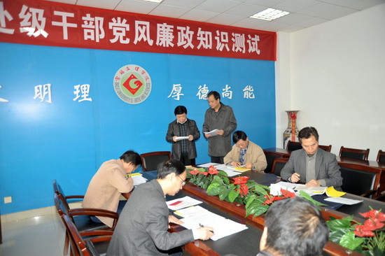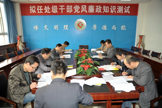 3月18日下午,校纪委在新校区第一会议室对拟提拔的9名干部进行了党风廉政知识测试。校党委副书记、纪委书记米晓东亲临考场给予指导。纪委副书记邓忠良负责测试的主考工作。