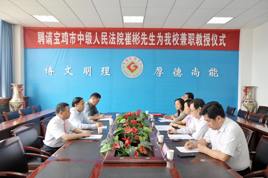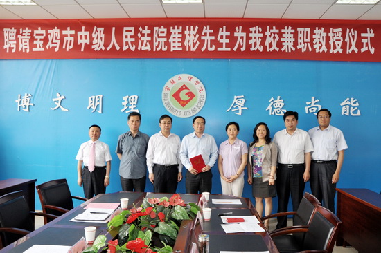 5月24日下午,beat365在新校区第一会议室举行了聘请宝鸡市中级人民法院副院长崔彬先生为兼职教授仪式。副校长赵荣侠出席会议并讲话,科技处处长田延峰主持聘任仪式。