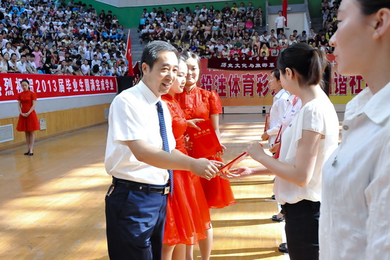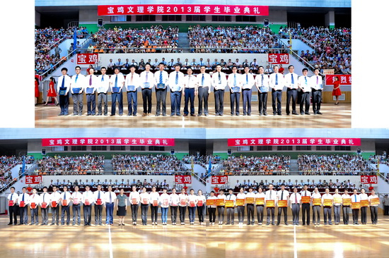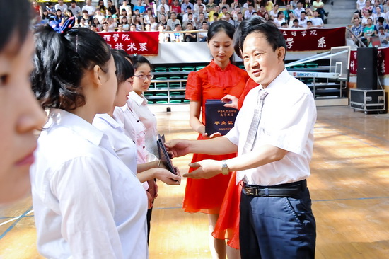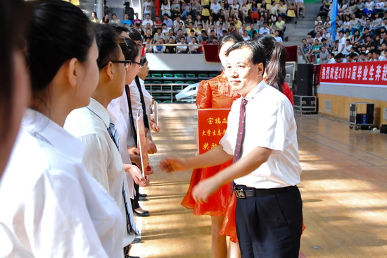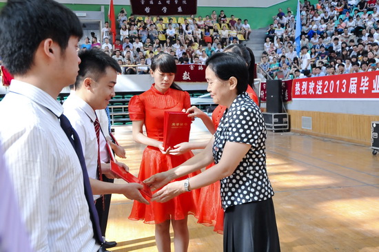 王志刚、白黎向毕业生代表颁发了毕业证书;傅志军、赵荣侠为优秀毕业生代表颁发荣誉证书;杨子元为西部志愿者颁发奖金。教务处处长王富平宣读了2013届学生毕业资格审查结果;学工部(处)长、毕业生就业指导服务中心主任李周让宣布了优秀毕业生及大学生志愿服务西部计划学生名单。