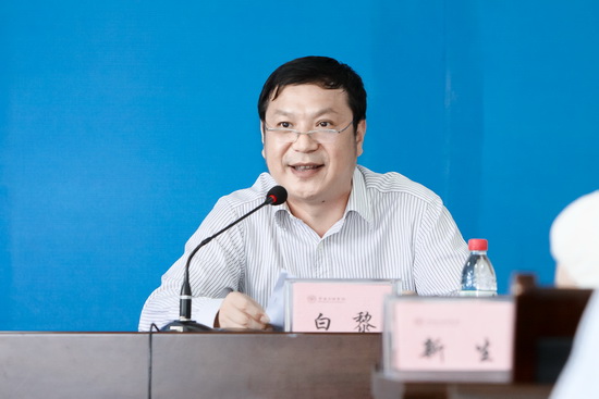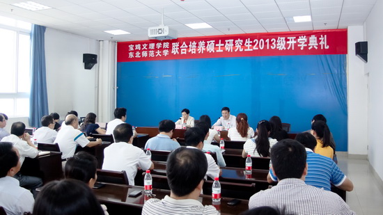 在典礼上,白黎发表了重要讲话。他代表学校向新入学的2013级硕士研究生表示热烈欢迎和诚挚祝贺!他向新生介绍了宝鸡的历史、经济、文化、交通等基本概况以及学校发展的历史沿革和学校近年来在学科建设、本科教育、导师队伍、办学环境等方面取得的重要成就。同时,他向2013级硕士研究生提出了希望和要求:一是志存高远,勇于担当,胸怀远大理想;二是务本立德,勤学笃实,努力提升创新能力。三是健全身心,和谐发展,力求综合素质的整体提升。他希望同学们在获取知识、提升能力的同时要养成健全的人格,学会做事,善于沟通,团结同学,积极参加校内学术文化活动,注重锻炼身体,培养健康体魄,学会感恩,善待亲朋,关爱社会,做一个思想高尚、内心丰富、精神昂扬、人格健全、阳光健康、积极向上的时代学子。希望同学们发扬“艰苦奋斗,励精图治,开拓创新,敢为人先,立心立命,勇于担当”的宝文理精神,刻苦学习、努力奋进,用青春与汗水、知识与毅力,取得优异的成绩,谱写人生美好的华章。