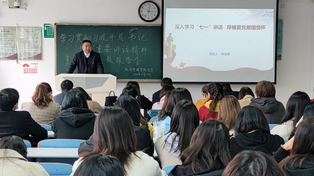 为了推动党史学习教育深入开展,强化师生思想理论武装,10月20日下午,经济管理学院在思贤楼105教室举办学习贯彻习近平总书记“七一”重要讲话精神专题辅导报告会,学科建设与发展规划处处长孙宏健教授应邀作了题为《深入学习“七一”讲话,厚植爱党爱国情怀》的报告。报告会由经济管理学院党委书记郝晓炜主持。