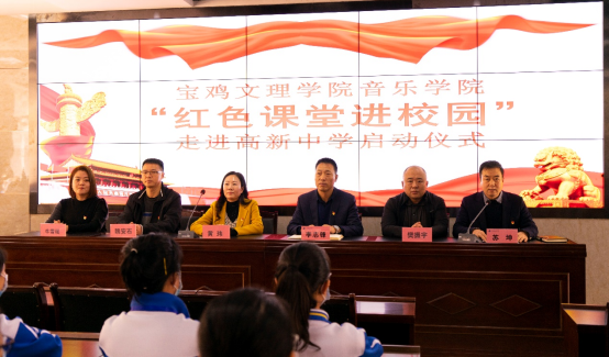 为深入推进党史学习教育和“我为群众办实事”实践活动,10月29日下午,音乐学院“红色课堂进校园”启动仪式在高新中学举行。音乐学院党总支书记黄玮,院长魏安石,副书记、副院长樊振宇,高新中学校长李志峰,高新中学党支部副书记、副校长苏坤参加活动。活动由高新中学艺体中心负责人梁靖主持。
