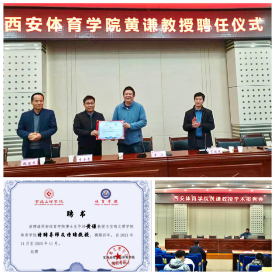 11月16日下午,西安体育学院黄谦教授聘任仪式暨学术报告会在木铎厅举行。体育学院党政领导和师生代表参会,会议由体育学院党总支书记丁煜成主持。黄谦,博士,二级教授,博士生导师,陕西省哲学社会科学领域领军人才,享受国务院政府特殊津贴专家,被授予“国家有突出贡献的中青年专家”荣誉称号。